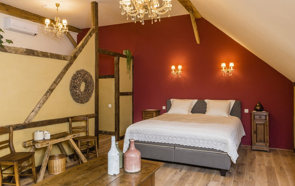 De hooizolder van weleer werd omgebouwd tot een zeer ruime kamer met een rustiek en gezellig karakter. De kamer dankt haar uitstraling aan het oud lemen vakwerk, eiken balken en zijn kristallen lusters. In deze ruimte met een hoog plafond en laag raam met zicht op de binnenkoer, vind je een zeer rustgevend gevoel.